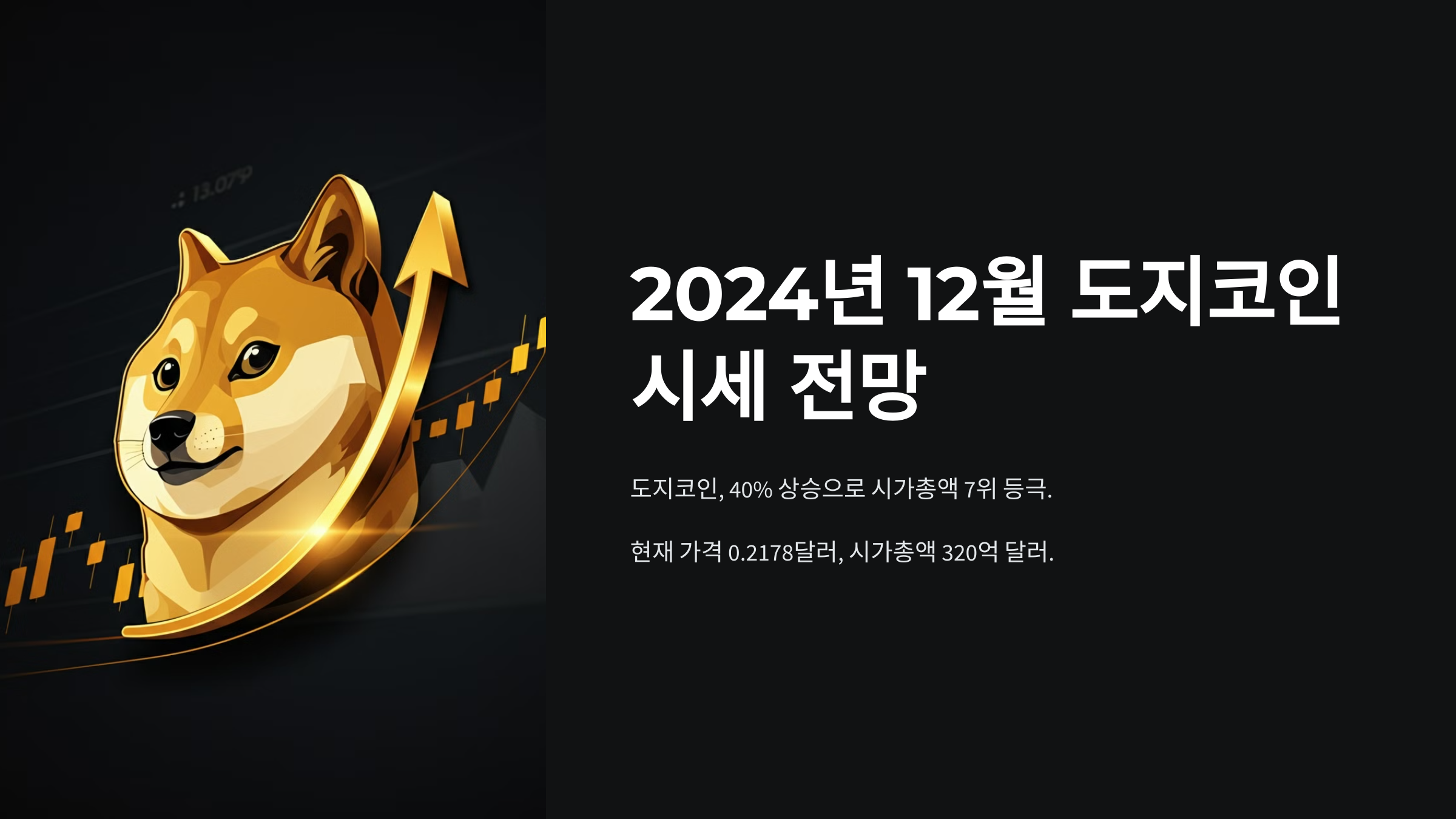 도지코인 시세 전망 12월 도지코인(DOGE)의 시세 전망에 대해 살펴보겠습니다. 최근 도지코인은 놀라운 상승세를 보이며 특히 주목받고 있습니다. 지난 한 주 동안 가격이 무려 40% 가까이 오르면서 리플(XRP)을 제치고 시가총액 7위에 올라섰습니다. 현재 도지코인의 가격은 약 0.2178달러이며, 시가총액은 약 320억 달러에 달합니다.