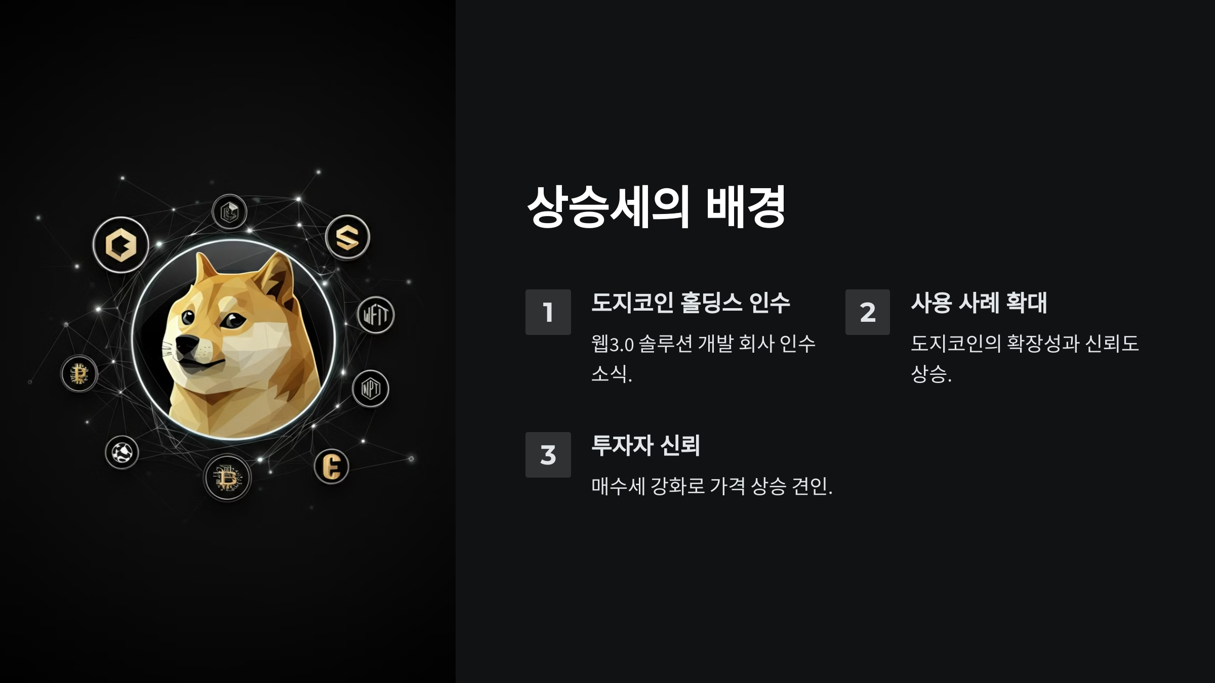 상승세의 배경 이러한 상승세의 배경에는 최근 발표된 도지코인 홀딩스의 인수 소식이 큰 영향을 미쳤습니다.