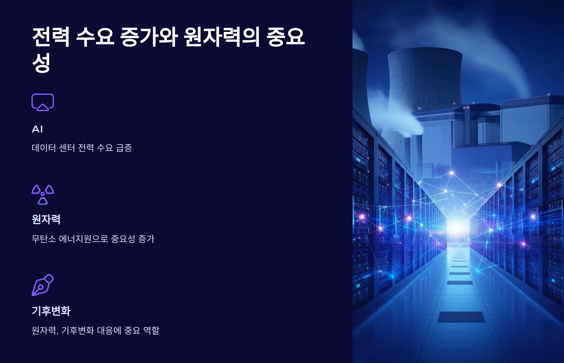 전 세계적으로 인공지능(AI)과 데이터 센터의 전력 수요가 급증하면서, 원자력 발전에 대한 수요가 늘어날 것으로 보입니다. 특히 AI의 발전으로 데이터 센터의 전력 소비가 증가할 것이며, 무탄소 에너지원으로서의 원자력이 기후변화 대응에 중요한 역할을 할 것입니다.