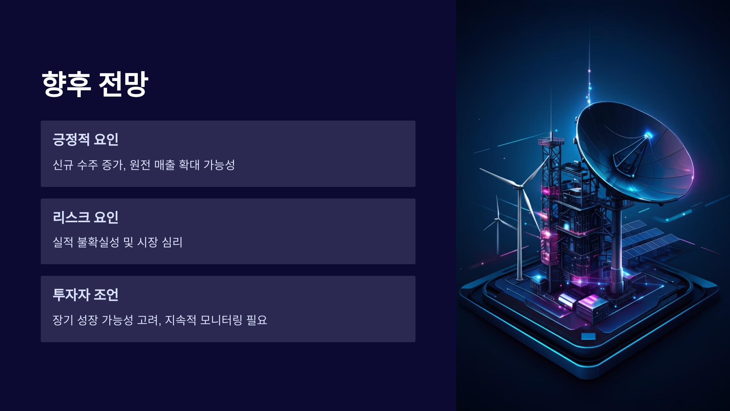 - 긍정적 요인: 신규 수주 증가, 원전 매출 확대 가능성