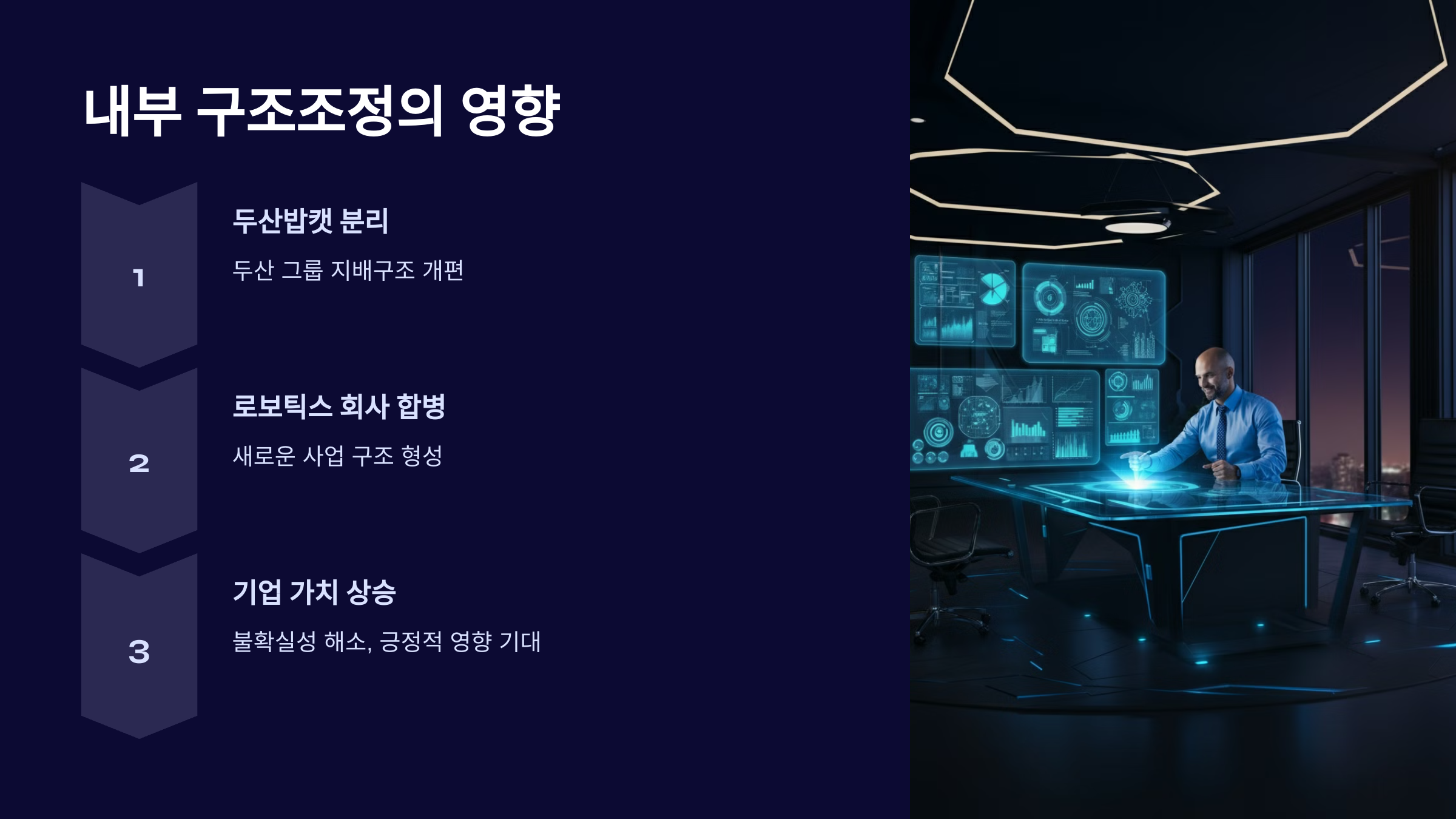 두산 그룹의 지배구조 개편에 따라, 두산에너빌리티는 두산밥캣을 분리하고 새로운 로보틱스 회사와 합병하는 방식으로 구조조정이 이루어졌습니다. 이러한 변화는 기업 가치를 높이고, 불확실성을 해소하는 데 긍정적인 역할을 할 것으로 보입니다.