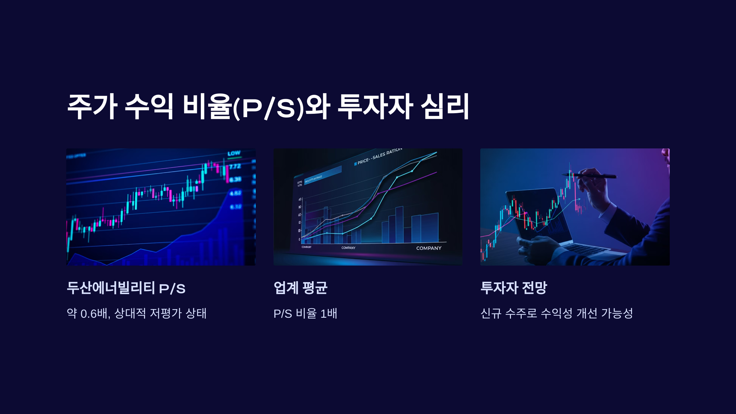 두산에너빌리티의 P/S 비율은 약 0.6배로, 업계 평균 1배에 비해 상대적으로 저평가된 상태입니다. 이는 투자자들이 매출 성장에 대해 회의적인 시각을 가지고 있음을 의미합니다. 그러나 증권사들은 신규 수주와 매출 증대가 이루어지면 수익성 개선이 가능할 것이라 보고 있습니다.
