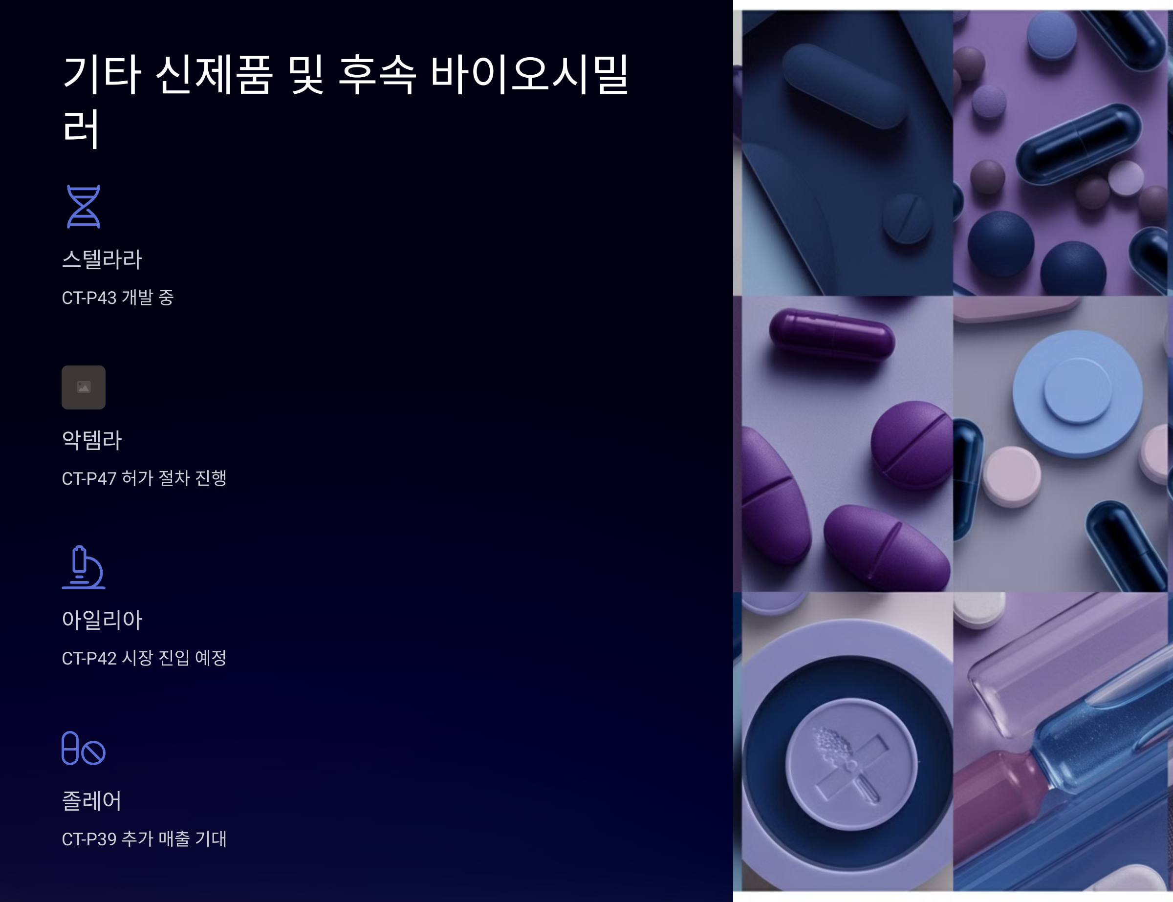 셀트리온은 짐펜트라 외에도 다양한 바이오시밀러 제품 개발을 진행 중입니다. 스텔라라(CT-P43), 악템라(CT-P47), 아일리아(CT-P42), 졸레어(CT-P39), 프롤리아(CT-P4) 등이 허가 절차를 거치고 있으며, 이들 제품이 시장에 진입하면 추가적인 매출 성장이 예상됩니다.
