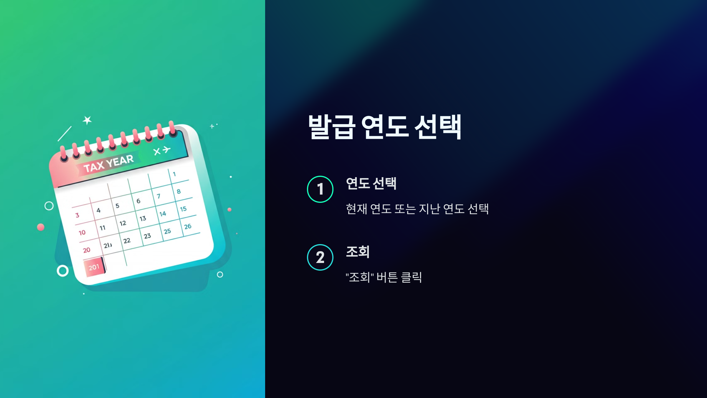 조회/발급 메뉴에 들어가면, 원하는 연도를 선택하셔야 합니다. 보통 직장에서 발급받는 원천징수영수증은 현재 연도 또는 지난 연도를 기준으로 합니다. 필요한 연도를 선택한 뒤 "조회" 버튼을 눌러주세요.