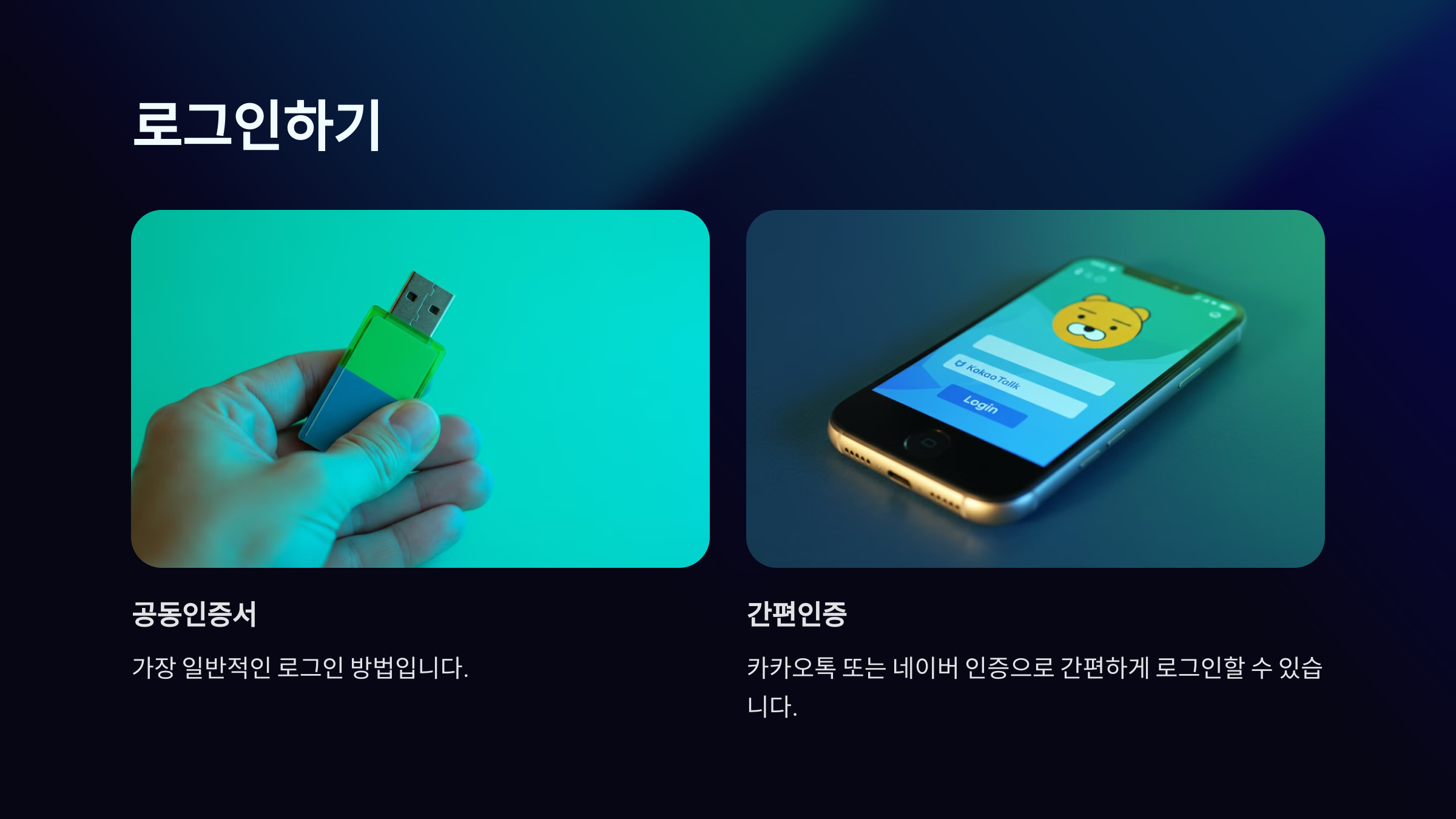 - 로그인 방법: 공동인증서가 없으신 분들은 사전에 모바일 인증을 준비해 두시면 더 편리합니다.