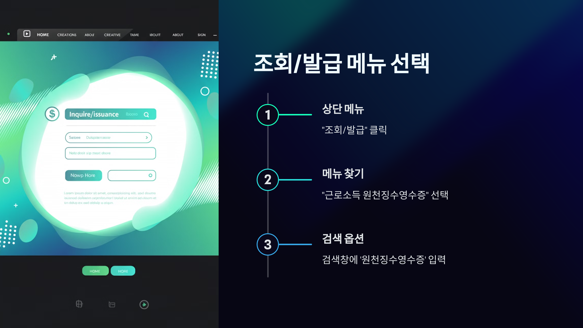 로그인 후 홈 화면에서 상단 메뉴 중 "조회/발급"을 클릭합니다. 여기에서 "근로소득 원천징수영수증"을 찾으시면 됩니다. 메뉴 이름이 조금 길어서 찾기 어렵다면, 화면 상단의 검색창에 '원천징수영수증'을 입력해 쉽게 찾아보세요.