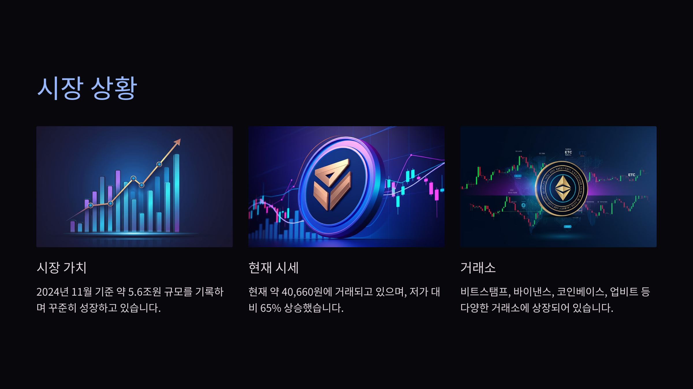 - 주요 거래소(비트스탬프, 바이낸스, 코인베이스) 및 한국의 업비트, 코인원, 빗썸에서도 활발히 거래되고 있습니다.
