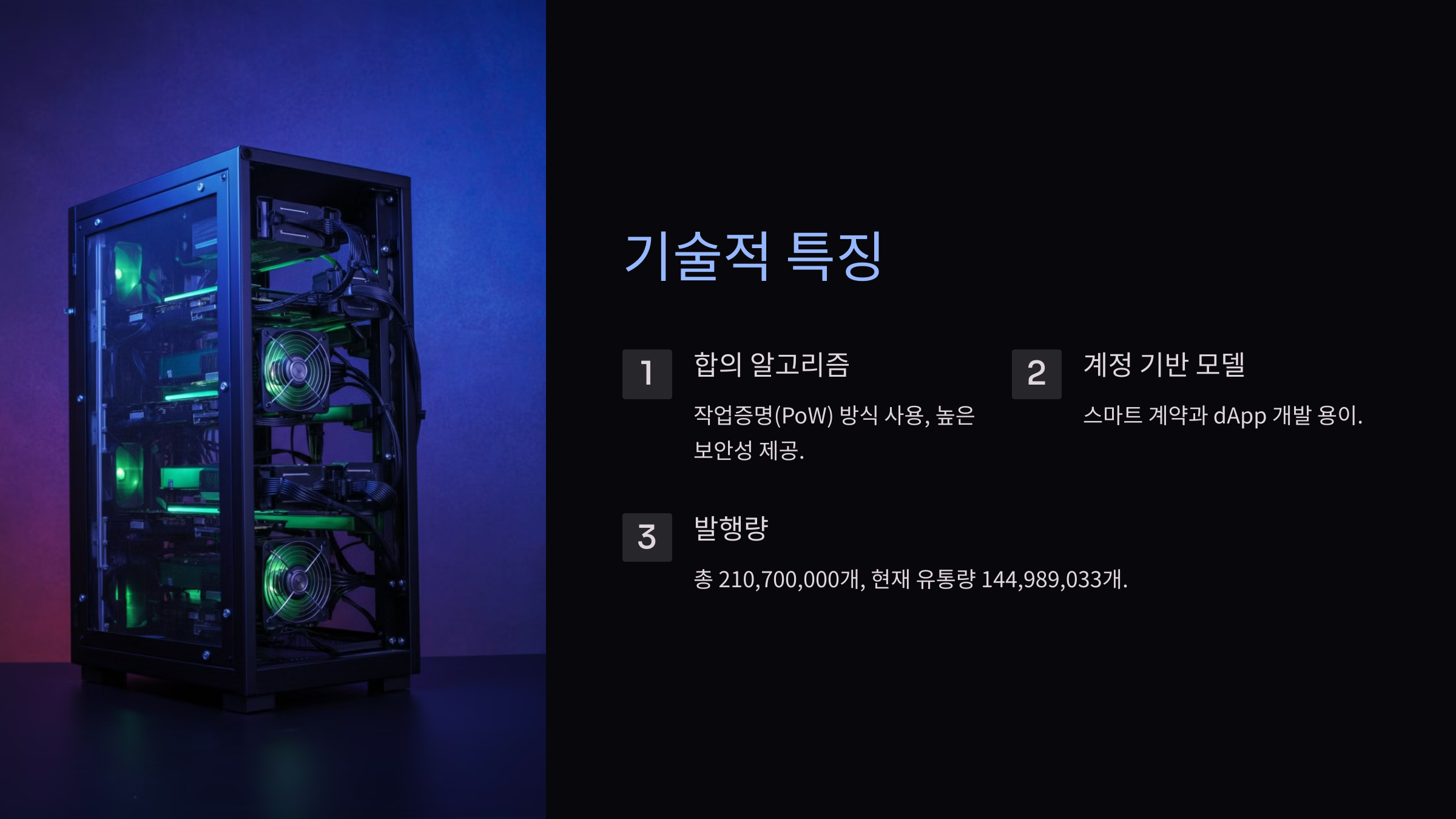 - PoS로 전환한 이더리움과 달리 PoW를 유지하면서 독자적인 기술적 방향을 추구하고 있습니다.