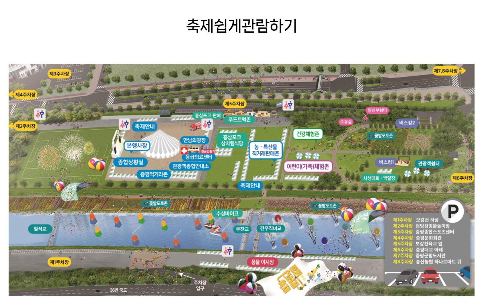 - 보강천 둔치 주차장: 축제장과 가장 가까운 주차장으로, 매우 편리하지만 빨리 만차가 됩니다.
