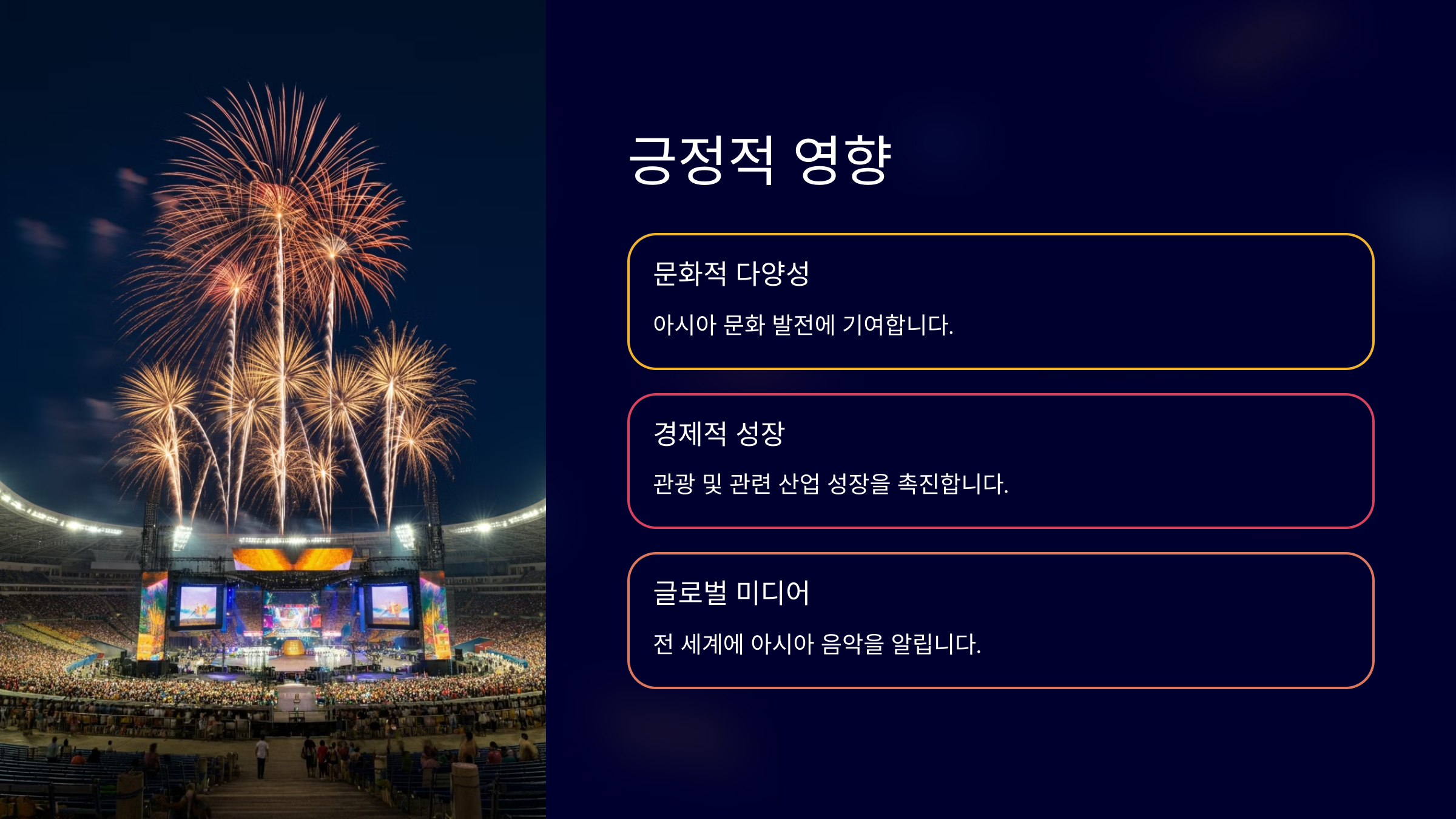 이러한 기대효과는 아시아 각국의 아티스트와 팬, 그리고 지역 사회에 긍정적인 영향을 미치며, 아시아 문화의 발전에 크게 기여할 것입니다.