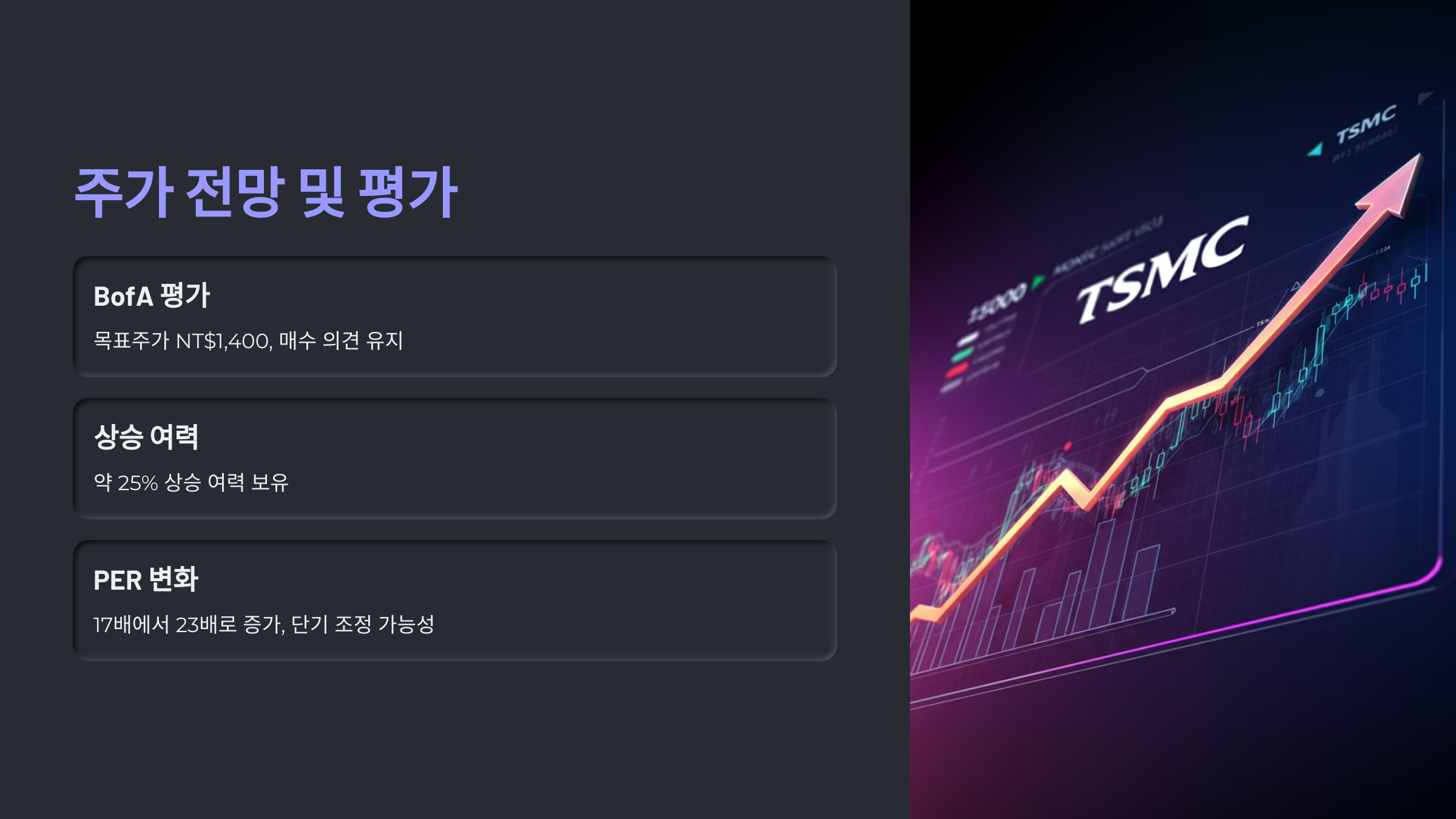 BofA는 TSMC의 주가 목표를 NT$1,200에서 NT$1,400으로 상향 조정하며 매수 의견을 유지하고 있습니다. TSMC는 매출 성장과 함께 약 25%의 상승 여력을 보유하고 있다고 평가됩니다. 하지만 현재 TSMC의 주가수익비율(PER)이 17배에서 23배로 증가했기에 단기적으로는 가격 조정 가능성도 있습니다.