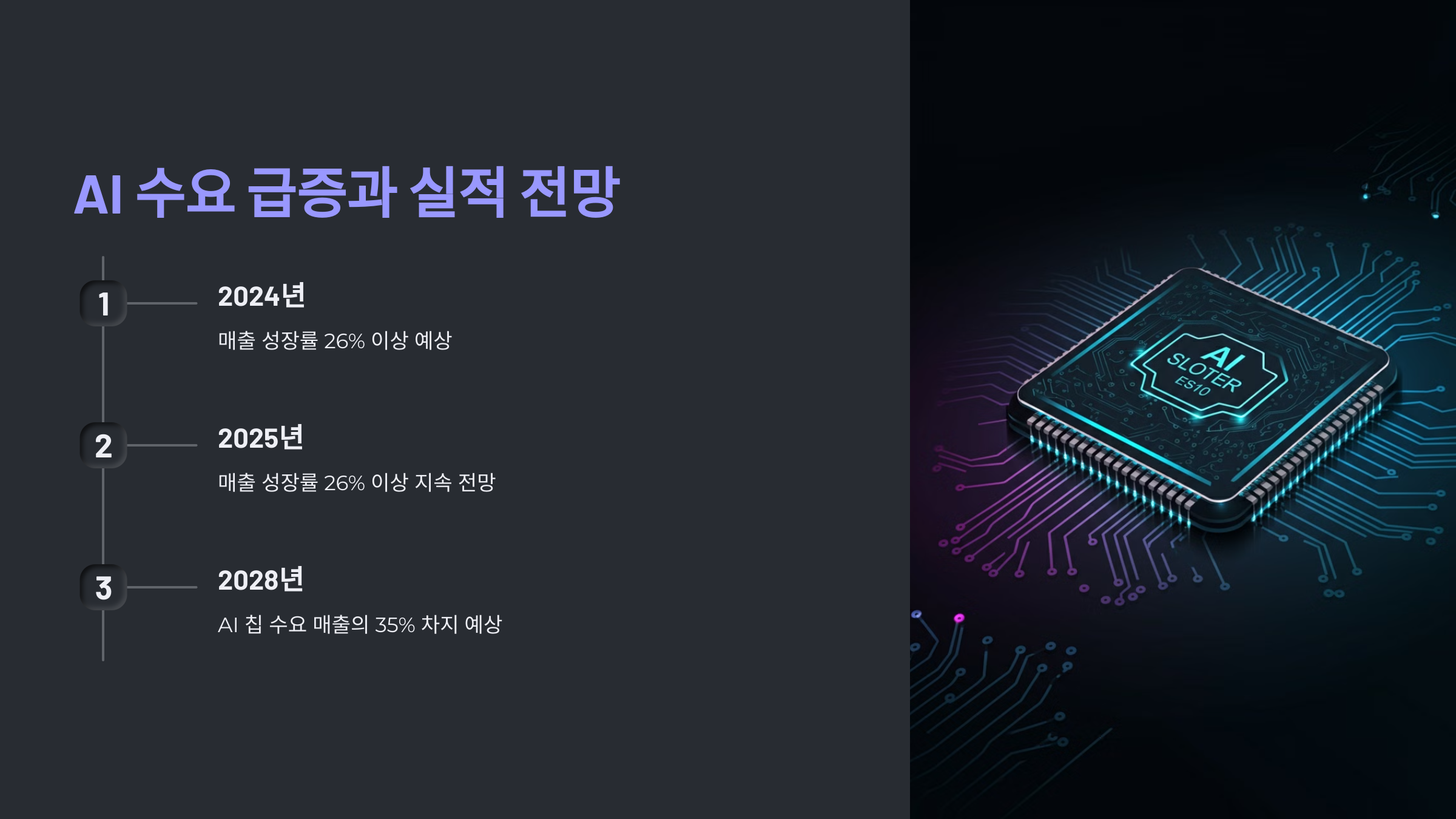AI 칩에 대한 수요는 TSMC의 매출에서 중요한 비중을 차지할 것으로 예상됩니다. NH투자증권의 임지용 연구원은 AI 수요가 가속화되면서 TSMC의 실적 추정치가 상향될 가능성이 높다고 분석했습니다. TSMC는 2024년과 2025년 매출 성장률이 각각 26% 이상에 이를 것으로 기대하고 있으며, AI 칩 수요는 2028년까지 매출의 약 35%를 차지할 전망입니다.