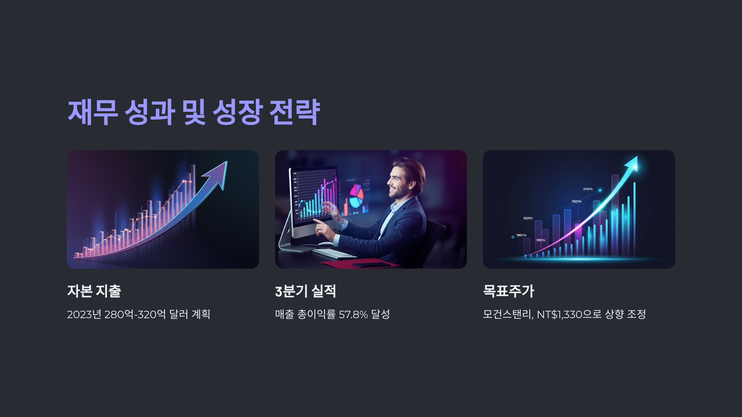 2023년 TSMC는 자본적 지출을 증가시켜 280억~320억 달러를 계획하며, 이는 반도체 시설 확장을 위한 핵심 요소입니다. 최근 TSMC의 3분기 실적은 시장 예상치를 초과했으며 매출 총이익률이 57.8%에 달했습니다. 모건스탠리는 TSMC의 목표주가를 NT$1,220에서 NT$1,330으로 상향 조정하며, 여전히 안정적인 매출 성장을 전망하고 있습니다.